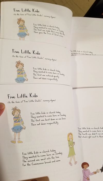 Answer: I get that question often, thanks for asking! There are 3 editions, for Orthodox Christians, Catholics and all Christians. They are mainly the same, except for a few variations, mainly in the "Church Time Basics" section. For example, in the Orthodox version, it says to cross yourself from right to left, but in the other versions, it says to cross yourself from left to right. Another example is in the song "Five Little Kids", some verses are changed, especially as the faithful enter the church (see picture). There are couple extra songs in the Orthodox version about Holy Icons and receiving Communion.